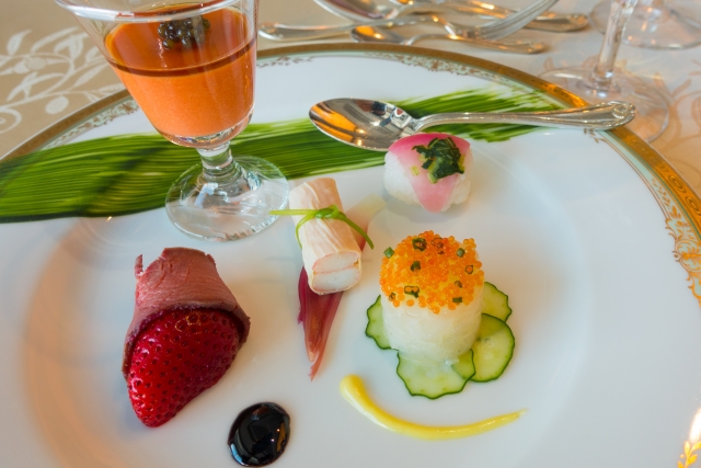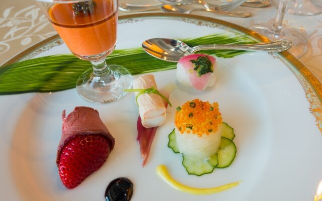 前菜には、北海道産の希少なウニとキャビアを使用したデリケートな味わいのテリーヌ。スープは、トリュフとポルチーニ茸を使った濃厚なビスクで、奥深い風味をお楽しみいただけます。メインは、最高級の和牛を石焼きでじっくり焼き上げ、自家製のソースで。デザートは、ヴァローナチョコレートを使った濃厚なガナッシュケーキに、金箔をあしらった極上の一品。